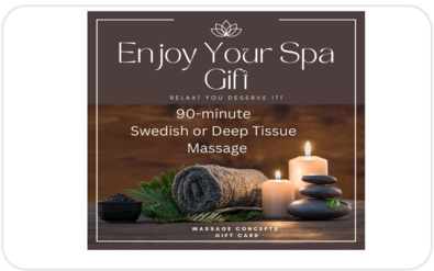 Gift Card for one 90-minute Massage Session -Swedish or Deep Tissue.