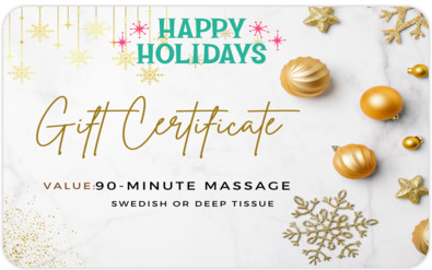 Enjoy your gift! Have a great holiday season! Enjoy this Wellness Gift Card for a 90-minute Massage - Swedish or Deep Tissue.