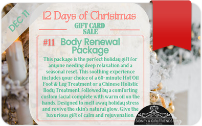#11 Body Renewal Package - This package is the perfect holiday gift for anyone needing deep relaxation and a seasonal reset. This soothing experience includes your choice of a 60-minute Hot Oil Foot & Leg Treatment or a 60-minute Chinese Holistic ...